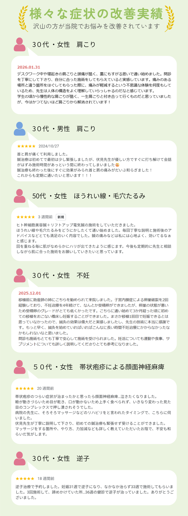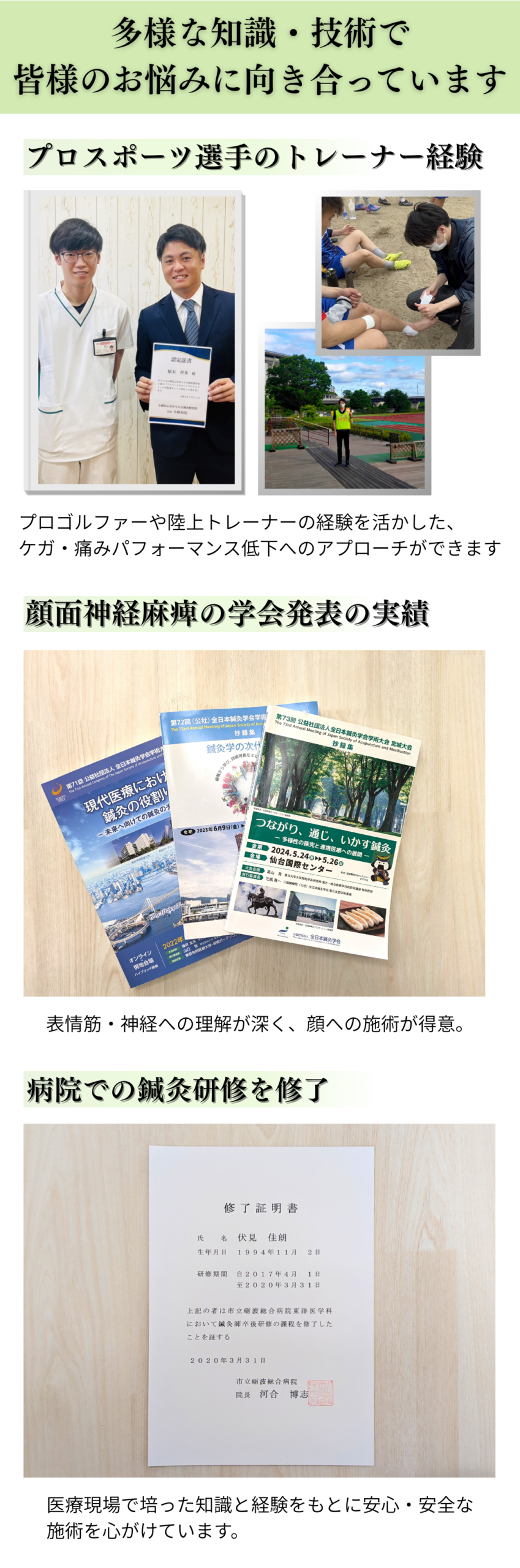 悩みをしっかり聞くことを大事にしています。医療的に症状について深堀りするだけではなく、症状によって生活でどういった支障を感じているかや将来的な不安まで、皆さまの悩みとしっかり向き合います。 症状を改善させることだけがゴールではないと思っています。 症状を改善したことでその後の人生がより豊かにできるような鍼灸を提供します。 皆様の人生に寄り添えるよう全力でサポートさせていただきます。