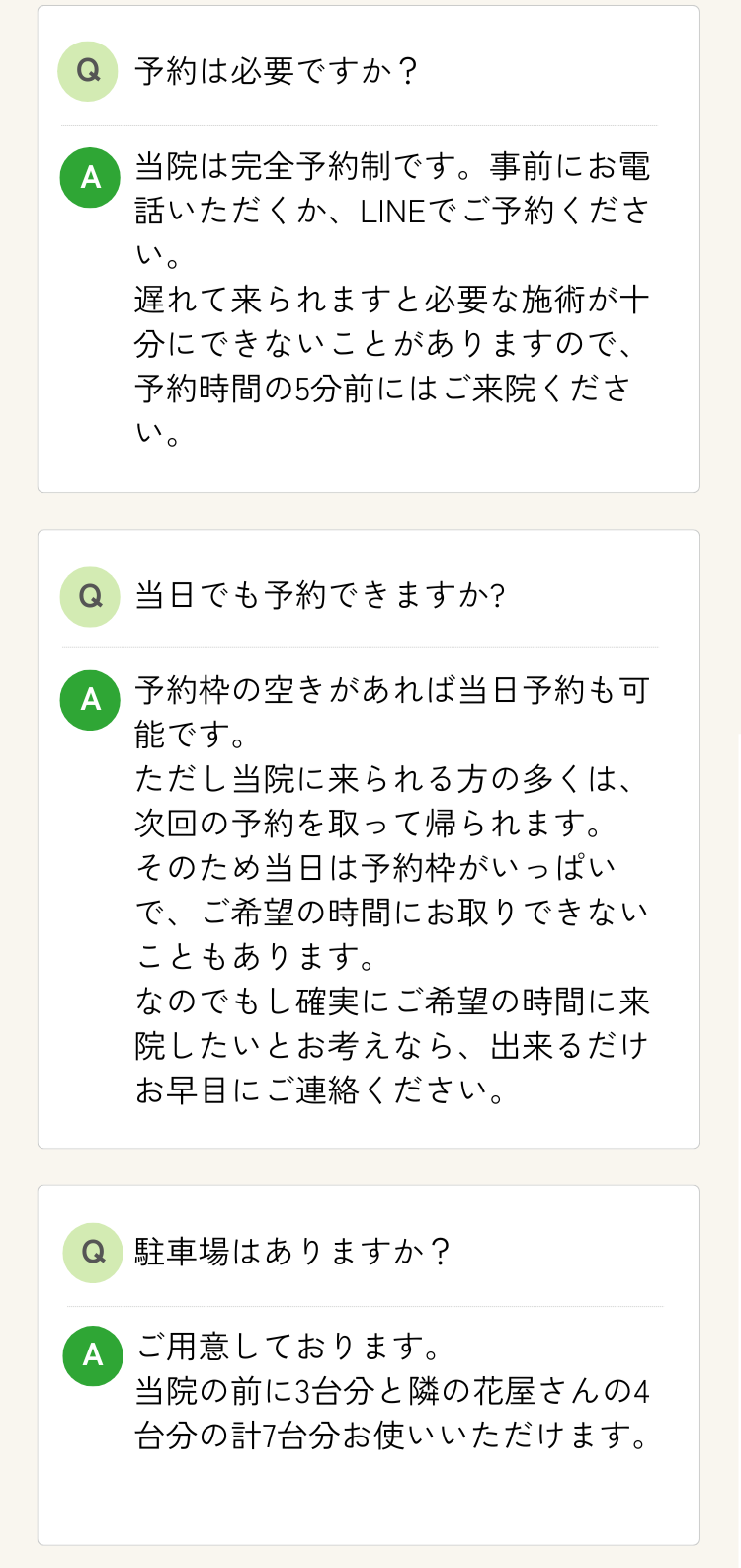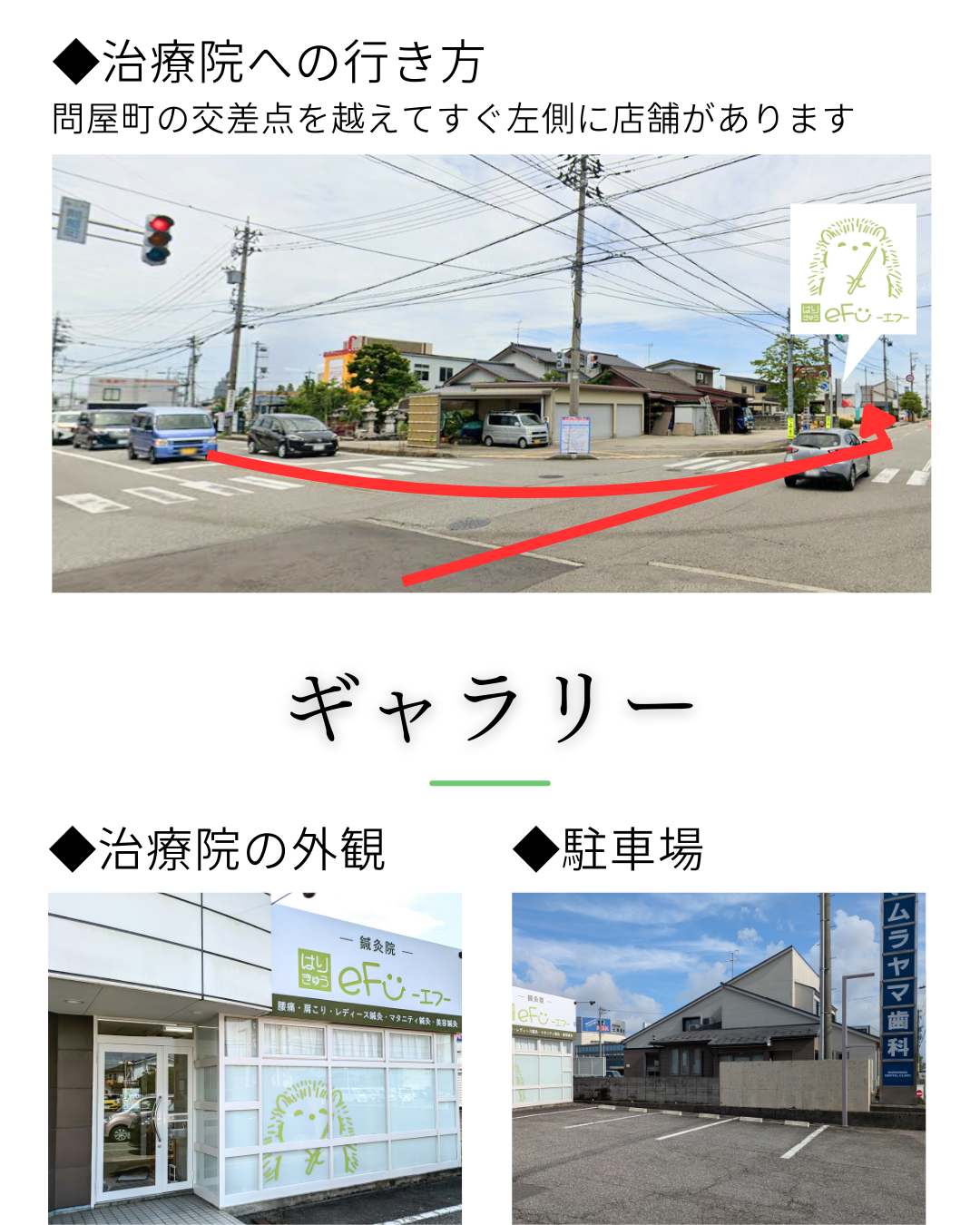 駐車場 治療院の前に4台分、 すべて埋まっている場合はお隣の花屋【GAKA】様の前の駐車場をお使いください
